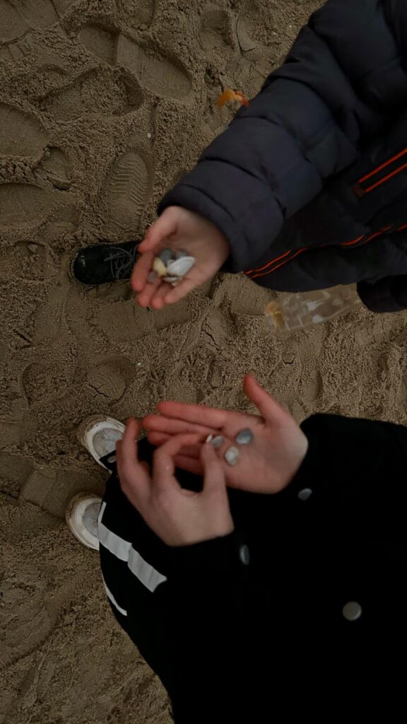 Niebo zasnute chmurami, powietrze świeże i spokojne, a fale delikatnie uderzają o brzeg. Na miękki piasek wybiegają dzieci — pełne ciekawości, rozgadane, szczęśliwe.