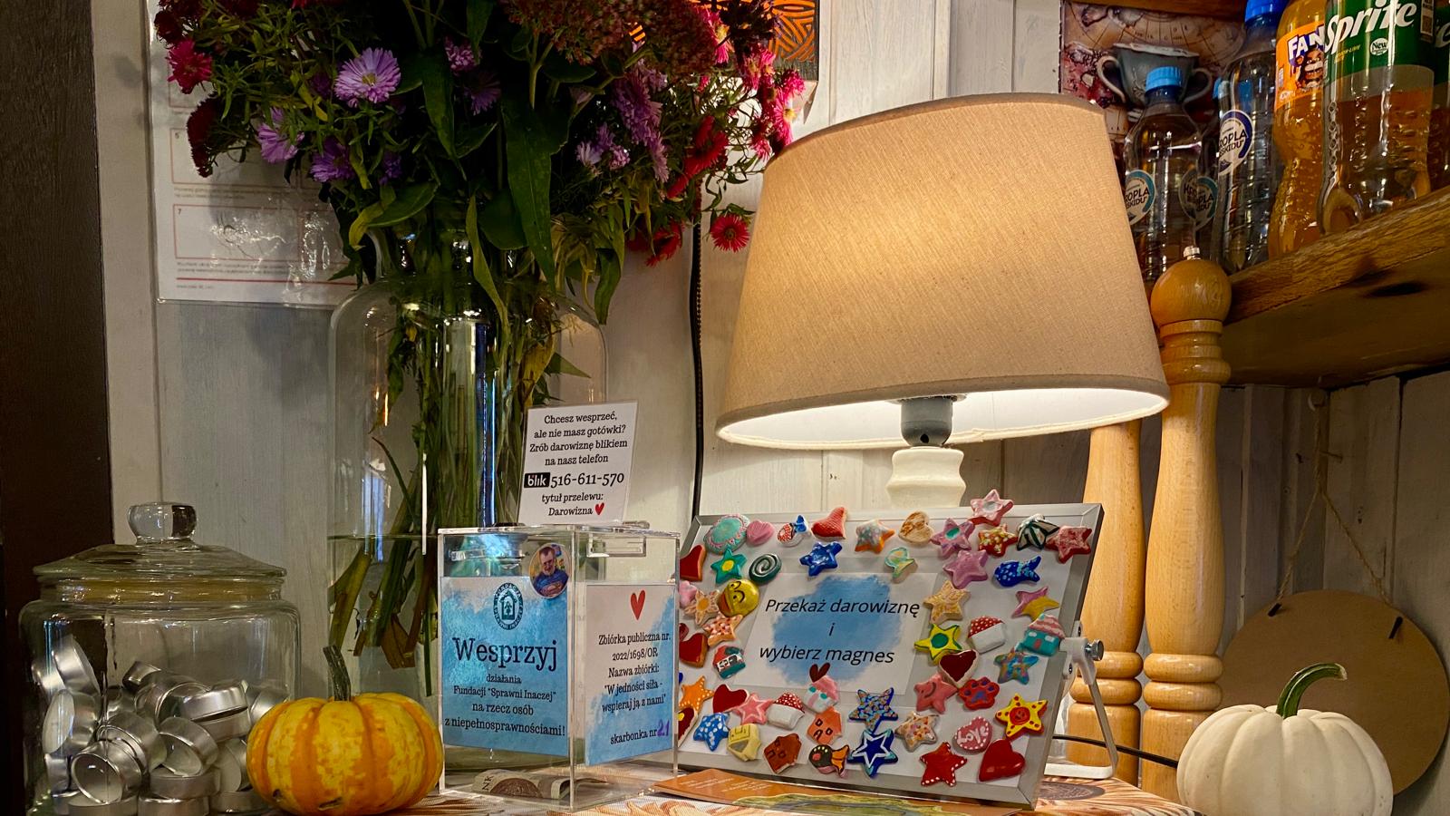 W środku czeka na Was skarbonka i tablica z naszymi magnesami — wrzuć grosik, weź magnes, zostaw ślad dobra 💫